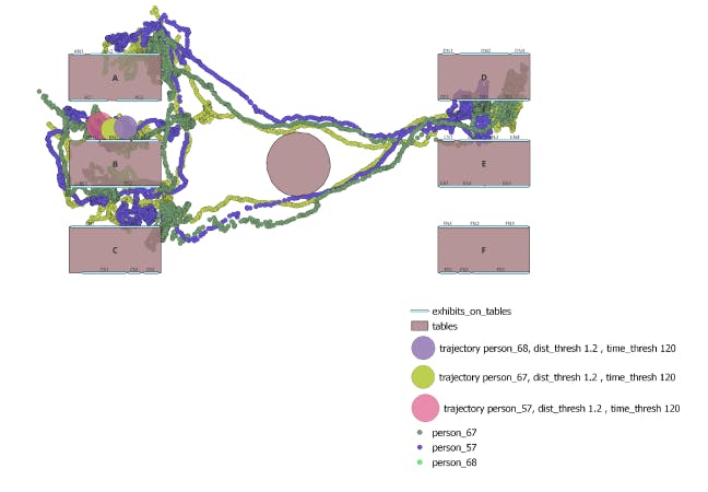 The analysis of trajectories of individuals visiting an area in a museum with the localization system which is based on UWB (Ultra Wide Band) and high sampling rate. The goals of the project were to find the stay points of the trajectories both individually and simultaneously using PyQGIS and QGIS Environment